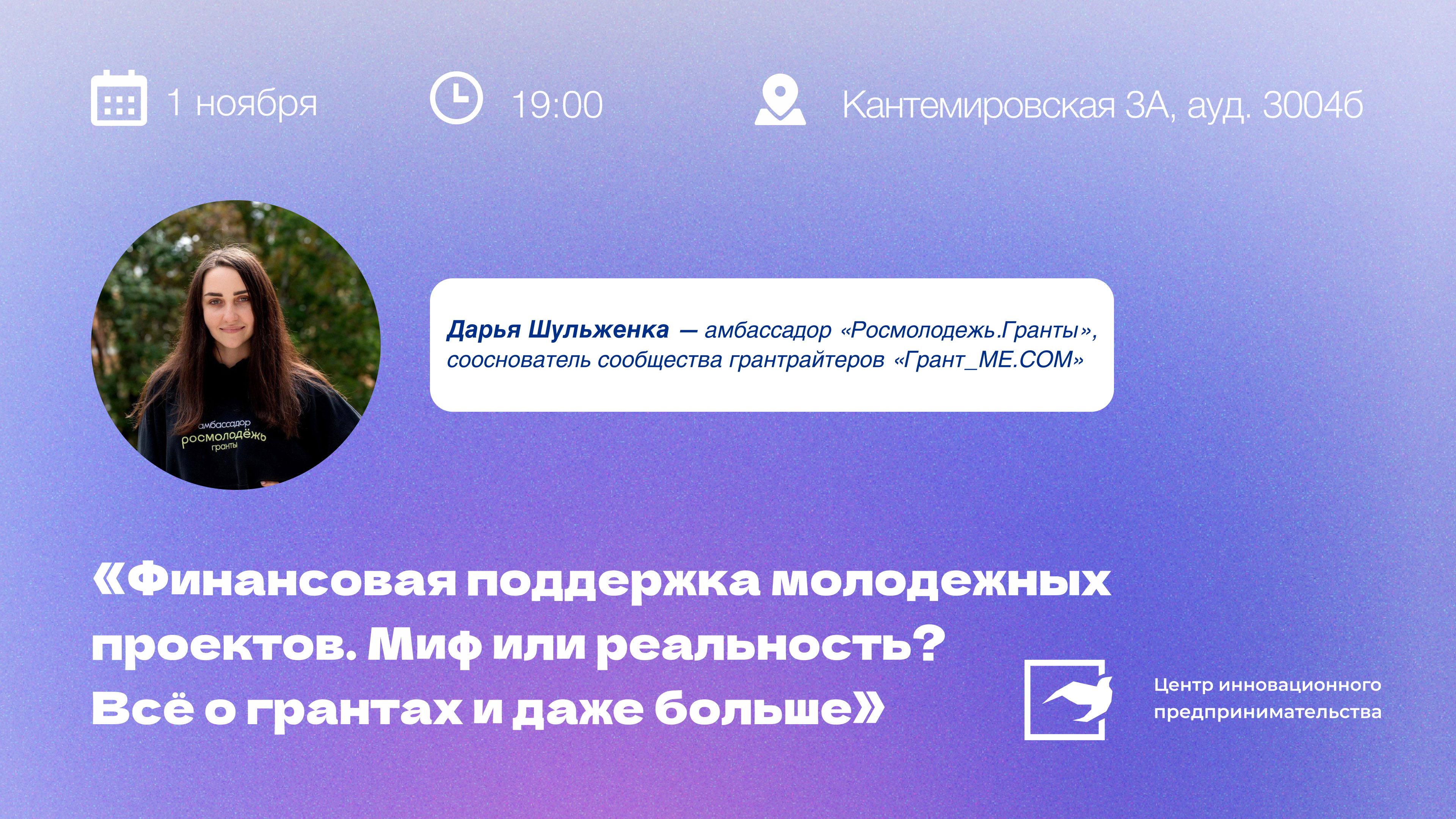 1 ноября в среду 19:00 Центр инновационного предпринимательства НИУ ВШЭ проводит очную встречу "Финансовая поддержка молодежных проектов. Миф или реальность? Всё о грантах и даже больше" и зовет всех желающих.